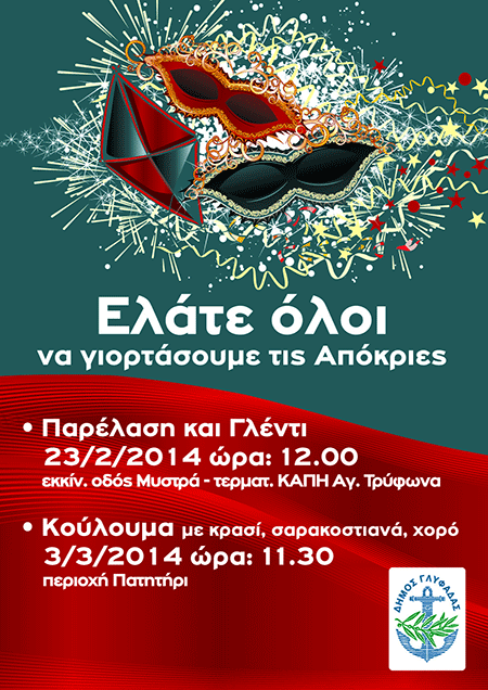 Με το μήνυμα «Ελάτε όλοι να γιορτάσουμε τις Απόκριες» ο Δήμος Γλυφάδας για 2η χρονιά προσκαλεί μικρούς και μεγάλους να λάβουν μέρος στην καρναβαλική παρέλαση που θα πραγματοποιηθεί την Κυριακή 23 Φεβρουαρίου 2014 και ώρα 12.00, (θα ξεκινήσει από την οδό Μυστρά και θα τερματίσει στο ΚΑΠΗ Αγ. Τρύφωνα) όπου όλοι μαζί θα διασκεδάσουμε στο αποκριάτικο γλέντι.