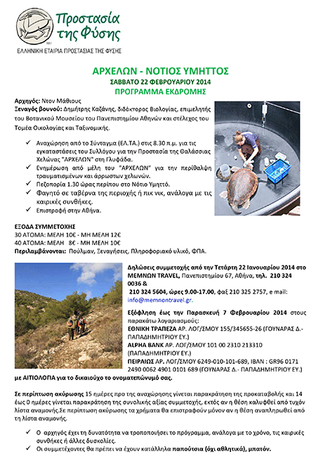 - Αναχώρηση από το Σύνταγμα (ΕΛ.ΤΑ.) στις 8.30 π.μ. για τις εγκαταστάσεις του Συλλόγου για την Προστασία της Θαλάσσιας Χελώνας “ΑΡΧΕΛΩΝ” στη Γλυφάδα.