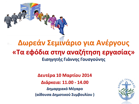 Το σεμινάρο απευθύνεται αποκλειστικά σε μη έχοντες εργασία και η διεξαγωγή του θα πραγματοποιηθεί Δευτέρα 10 Μαρτίου 2014 και ώρα 11.00 – 14.00 στο Δημαρχιακό Μέγαρο (αίθουσα συνεδριάσεων). Μετά το τέλος του σεμιναρίου θα χορηγηθεί βεβαίωση παρακολούθησης.