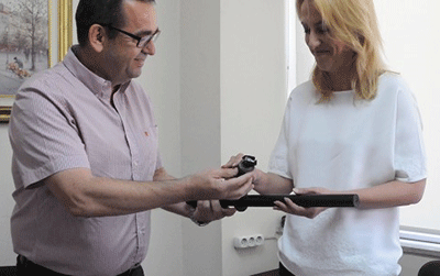 Ο Πρόεδρος της Εκτελεστικής Επιτροπής της Π.Ο.Ε.-Ο.Τ.Α. κ. Θέμης Μπαλασόπουλος, μετά την ολοκλήρωση της συζήτησης, παρέδωσε στην κυρία Ρένα Δούρου ένα γκλόπ και μία ανενεργή χειροβομβίδα κρότου λάμψης, από αυτά που έκαναν χρήση τα Μ.Α.Τ. κατά των εργαζομένων της Τοπικής Αυτοδιοίκησης όταν επιχειρούσαν να συναντήσουν τον απερχόμενο Περιφερειάρχη Αττικής για να του καταθέσουν τις προτάσεις τους.
