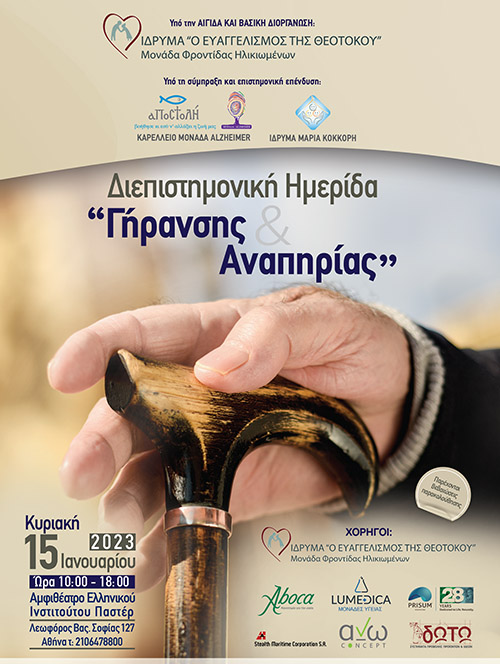 Ο Πρόεδρος του Ιδρύματος «Ο Ευαγγελισμός της Θεοτόκου» Αρχιμ. Δρ Νικόδημος Φαρμάκης, σας προσκαλεί στην Α’ Διεπιστημονική Ημερίδα για τη Γήρανση και την Αναπηρία, στο Ελληνικό Ινστιτούτο Pasteur την Κυριακή 15 Ιανουαρίου 2023 με ώρα προσέλευσης 10:00, με τη συμμετοχή έγκριτων Ακαδημαϊκών και Επιστημόνων Υγείας, με τη σύμπραξη και επιστημονική επένδυση των Ιδρυμάτων, «Μαρία Κόκκορη», «Καρελλείου» Μονάδας Αντιμετώπισης Νόσου Alzheimer και του Φιλανθρωπικού Οργανισμού «ΑΠΟΣΤΟΛΗ» της Ιεράς Αρχιεπισκοπής Αθηνών.