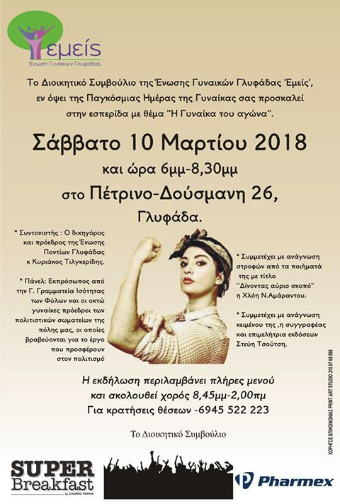 Το Διοικητικό Συμβούλιο της Ένωσης Γυναικών Γλυφάδας “Εμείς”, εν όψει της Παγκόσμιας Ημέρας της Γυναίκας σας προσκαλεί στην εσπερίδα με θέμα “Η Γυναίκα του αγώνα”.