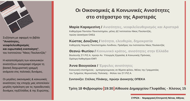 Σύριζα Γλυφάδας: Μια εξαιρετικά ενδιαφέρουσα εκδήλωση-συζήτηση για τις ανισότητες και τον ρόλο της Αριστεράς, ως βασική πολιτική πρόταση για την αντιμετώπισή τους, στις 8.2.20, στο Δημαρχείο Γλυφάδας.