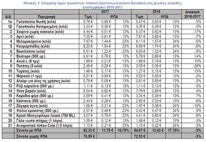 Οι τιμές έχουν επηρεαστεί από την αύξηση του συντελεστή ΦΠΑ την τελευταία τριετία, ωστόσο η τελική αξία του καλαθιού είναι σχεδόν ίδια με το 2014. Η αξία με τις τιμές προ ΦΠΑ είναι μειωμένη 3%.