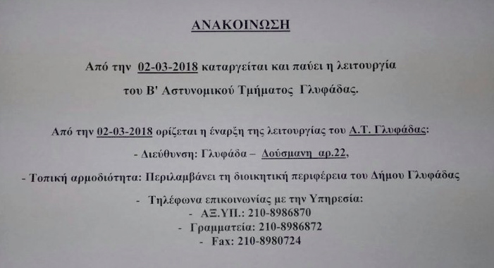 Η ανακοίνωση που αναρτήθηκε πριν από λίγες ημέρες από το Β’ Αστυνομικό Τμήμα Γλυφάδας, αναφέρει ότι από τις 2 Μαρτίου το τμήμα της οδού Β. Ηπείρου καταργείται και παύει να λειτουργεί καθώς συγχωνεύεται με το Α΄ Τμήμα Γλυφάδας στη οδό Δούσμανη.