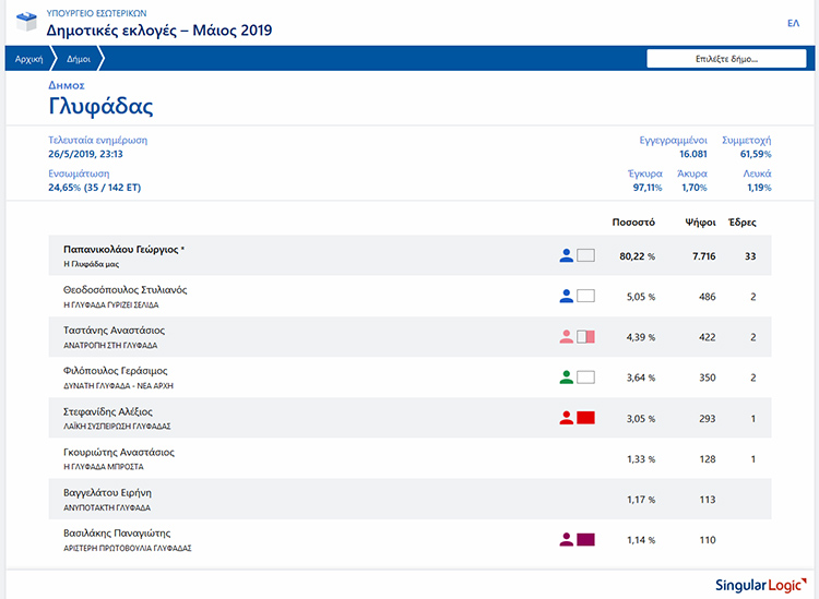 Ο νυν δήμαρχος, Γιώργος Παπανικολάου, φαίνεται ότι διεκδικεί την επανεκλογή του στον δήμο Γλυφάδας ήδη από τον πρώτο γύρο, όπως δείχνουν τα αποτελέσματα της Singular Logic μέχρι τώρα, με πολύ υψηλό ποσοστό, καταλαμβάνοντας 33 έδρες στο νέο δημοτικό συμβούλιο: