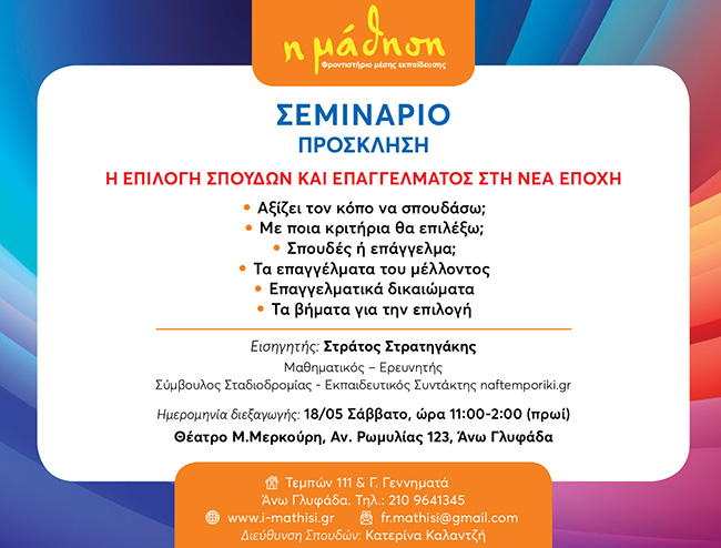 Το Εκπαιδευτικό Σεμινάριο τελεί υπό την αιγίδα του φροντιστηρίου Μέσης Εκπαίδευσης “η μάθηση” (Τεμπών 111 & Γ. Γεννηματά, Άνω Γλυφάδα – Τηλ.: 210 9641 345).