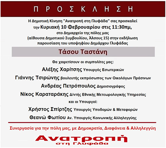 Η Δημοτική Κίνηση “Ανατροπή στη Γλυφάδα”, σάς προσκαλεί στο δημαρχείο της πόλης μας, Άλσους 15, στην εκδήλωση – παρουσίαση του υποψηφίου δημάρχου Γλυφάδας Τάσου Ταστάνη.