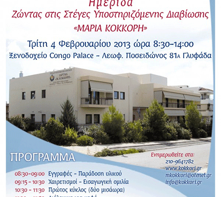 Οι Στέγες Υποστηριζόμενης Διαβίωσης (Σ.Υ.Δ) «Mαρία Κόκκορη», στις οποίες φιλοξενούνται κορίτσια με νοητική υστέρηση και σύνδρομο Down, σας προσκαλούν στην ημερίδα που διοργανώνουν με σκοπό την ενημέρωση του κοινού για τον τρόπο λειτουργίας και διαβίωσης στις Σ.Υ.Δ.