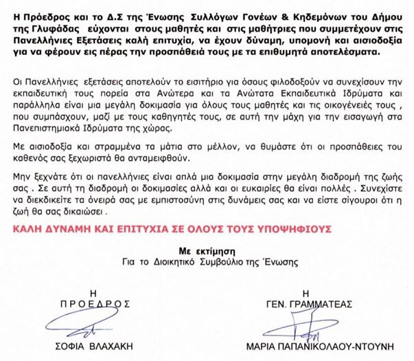 Η πρόεδρος και όλα τα μέλη της Δ/Βαθμιας σχολικής επιτροπής Γλυφάδας εύχονται ολόψυχα σε όλους τους μαθητές που ξεκινούν την Δευτέρα τις ΠΑΝΕΛΛΑΔΙΚΕΣ ΕΞΕΤΑΣΕΙΣ: “ΚΑΛΗ ΕΠΙΤΥΧΙΑ!! Διεκδικήστε τα όνειρα σας με εμπιστοσύνη στις δυνάμεις σας!!”