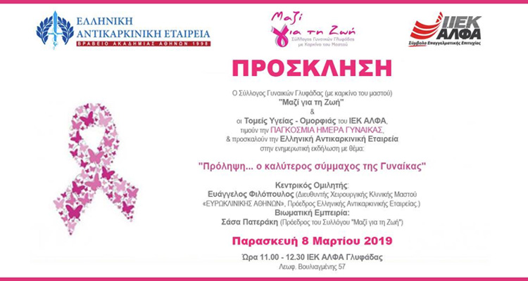 Η Πρόεδρος και το Διοικητικό Συμβούλιο του Συλλόγου Γυναικών Γλυφάδας (με καρκίνο του μαστού) “ΜΑΖΙ ΓΙΑ ΤΗ ΖΩΗ”, καθώς επίσης και οι Τομείς Υγείας – Ομορφιάς του ΙΕΚ “ΑΛΦΑ”, τιμούν την ΠΑΓΚΟΣΜΙΑ ΗΜΕΡΑ ΓΥΝΑΙΚΑΣ και προσκαλούν την Ελληνική Αντικαρκινική Εταιρεία στην ενημερωτική εκδήλωση με θέμα: