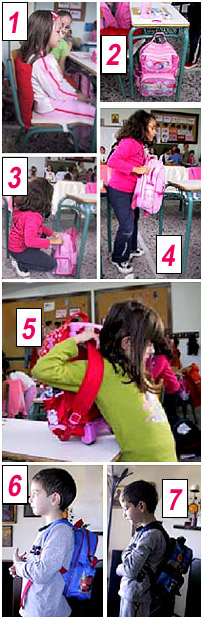 Τη σωστή τεχνική ανύψωσης της σάκας που είναι η εξής: βάζω τα βιβλία στην τσάντα λυγίζοντας τα πόδια και έχοντας ίσια την πλάτη (βλ. Φωτ. 3). Πιάνω τη σάκα με δυο χέρια, τη φέρνω στο στήθος και τη σηκώνω-τοποθετώ στο θρανίο (βλ. Φωτ. 4). Όλο το βάρος της σάκας πηγαίνει στα πόδια. Στη συνέχεια πιάνω τον έναν ιμάντα, τον βάζω στην πλάτη (βλ. Φωτ. 5) και μετά τον άλλον. Η σάκα πρέπει να είναι στην πλάτη (βλ. Φωτ. 6) και όχι να πιέζει τη μέση (βλ. Φωτ. 7).