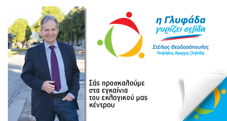 Η δημοτική παράταξη “Η Γλυφάδα Γυρίζει Σελίδα” και ο επικεφαλής, υποψήφιος Δήμαρχος Στέλιος Θεοδοσόπουλος, σάς προσκαλούν στα εγκαίνια του εκλογικού τους κέντρου (Γ. Γεννηματά 44 και Αιγύπτου, Τερψιθέα Γλυφάδας), την Κυριακή 21 Απριλίου 2019 και ώρα 12:00, όπου θα γνωρίσετε και τους νέους υποψήφιους δημοτικούς συμβούλους.