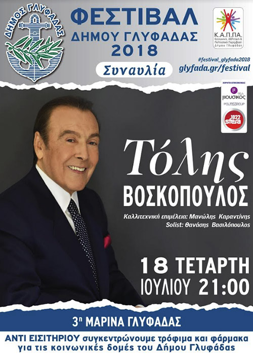 Ο ανεπανάληπτος Τόλης Βοσκόπουλος στο Φεστιβάλ Γλυφάδας 2018! Ο μεγάλος Έλληνας ερμηνευτής δίνει το παρών στο ετήσιο πολιτιστικό ραντεβού του Δήμου Γλυφάδας, με μια μεγάλη συναυλία την Τετάρτη, 18 Ιουλίου, στις 9 το βράδυ, στην 3η Μαρίνα Γλυφάδας. Η είσοδος στη συναυλία είναι ελεύθερη. Αντί εισιτηρίου, συγκεντρώνουμε τρόφιμα και φάρμακα για τις κοινωνικές δομές του Δήμου Γλυφάδας.