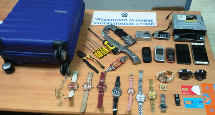 Κατασχέθηκαν ρολόγια, φωτογραφικές μηχανές, το χρηματικό ποσό των -750- ευρώ, ένα μαχαίρι καθώς και διαρρηκτικά εργαλεία