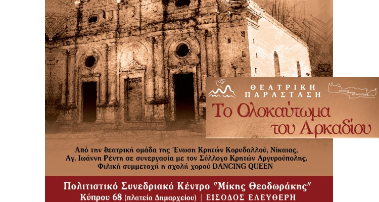 Ο Δήμαρχος Γιάννης Κωνσταντάτος και η Πολιτιστική Επιτροπή Δήμου Ελληνικού – Αργυρούπολης σας προσκαλούν στην θεατρική παράσταση «Tο Ολοκαύτωμα του Αρκαδίου» σε σκηνοθεσία Γιώργου Φιλιππάκη από την θεατρική ομάδα της Ένωση Κρητών Κορυδαλλού, Νίκαιας, Αγ. Ιωάννη Ρέντη σε συνεργασία με τoν Σύλλογο Κρητών Αργυρούπολης, το Σάββατο 23 Νοεμβρίου 2019 στο Πολιτιστικό Συνεδριακό Κέντρο «Μίκης Θεοδωράκης» Κύπρου 68.